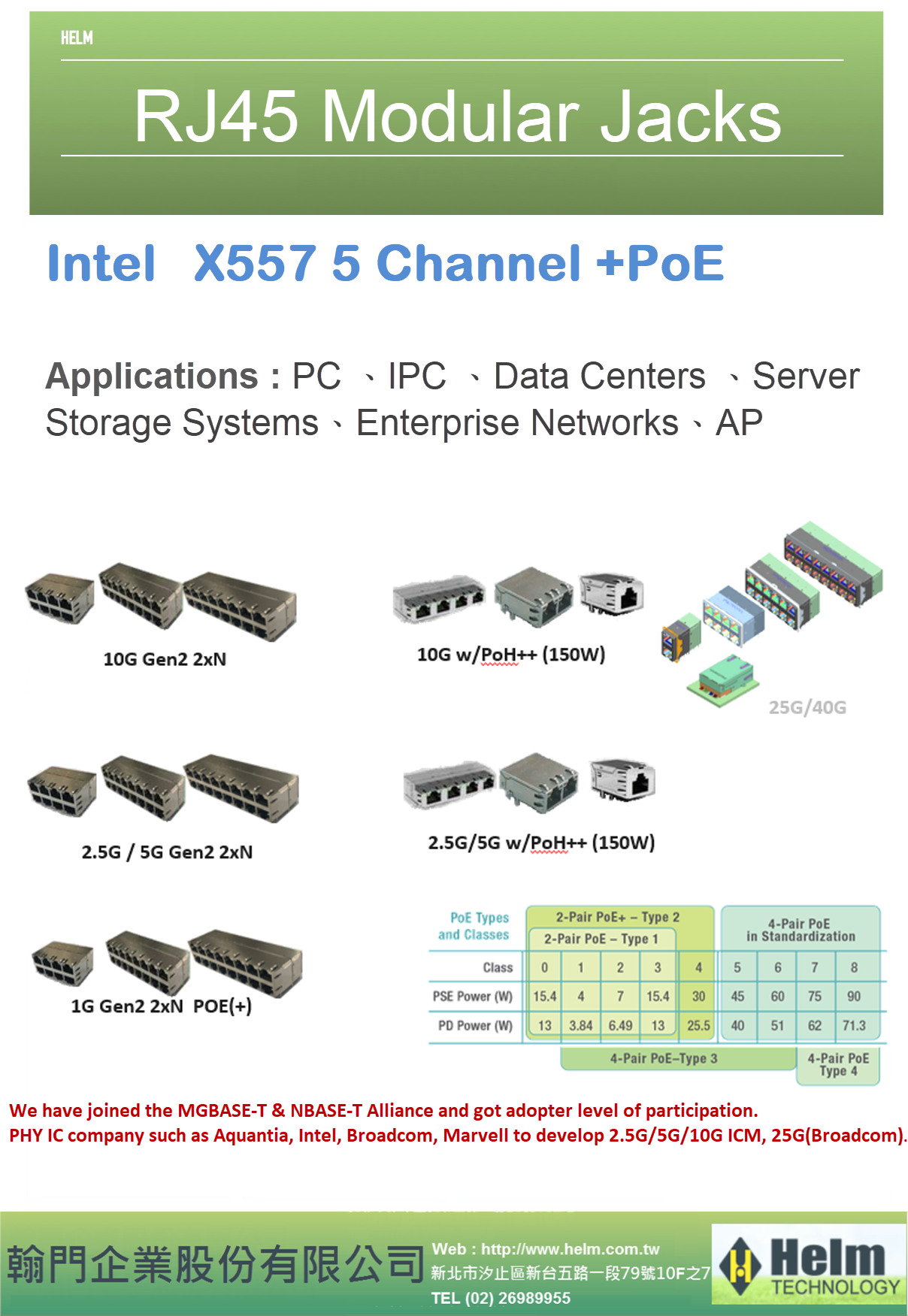 翰門企業代理RJ45 PoE Function INTEL_X557_ 5 通道+POE 90W 10G 系列規格 另有RJ45-25G/ 10G/2.5G/1G PHY-BCM、Marvell、Aquantia、Realtek 140W~15W系列 如有任何需求請聯繫翰門企業