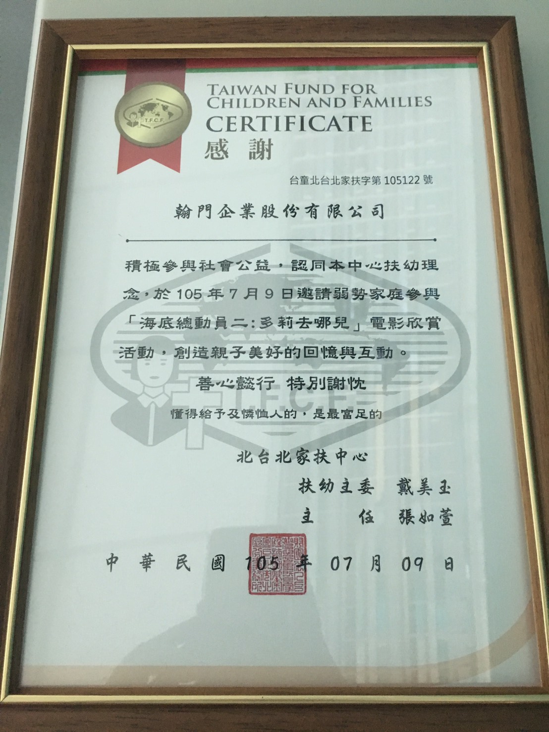 7/9(六)翰門福委會,舉辦與北台北家扶中心的兒童及家人,一同欣賞「海底總動員-2」,並且一起度過了一個愉快開心的週末下午。 謝謝翰門福委們的用心,及同仁對活動的支持與參與,家扶中心特地致贈獎狀,感謝企業的愛心及對社會的回饋。