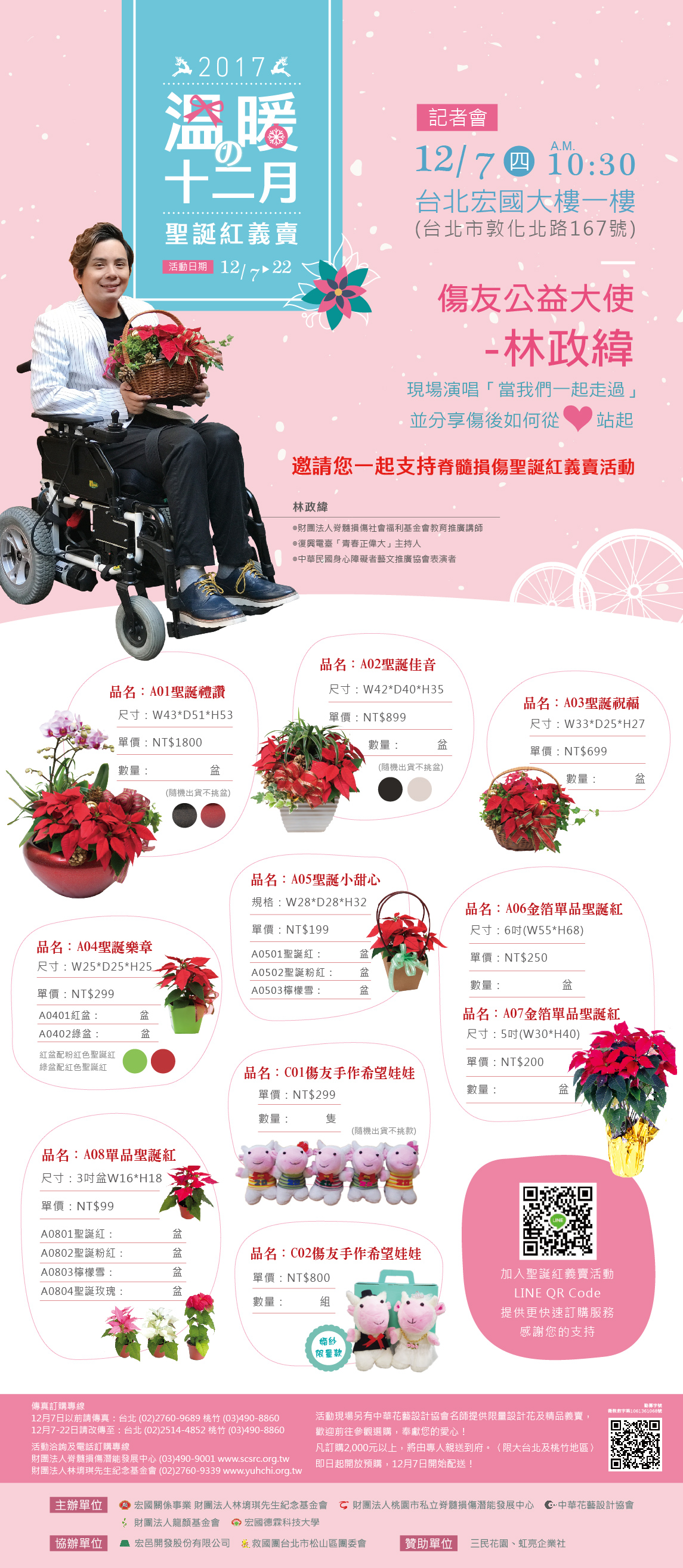 林堉琪先生紀念基金會和脊髓損傷潛能發展中心開始共同舉辦「溫暖的十二月,寒冬中的祝福,聖誕紅義賣活動」, 本企業在聖誔節前夕,也購買相關義賣產品,以協助協會之發展。