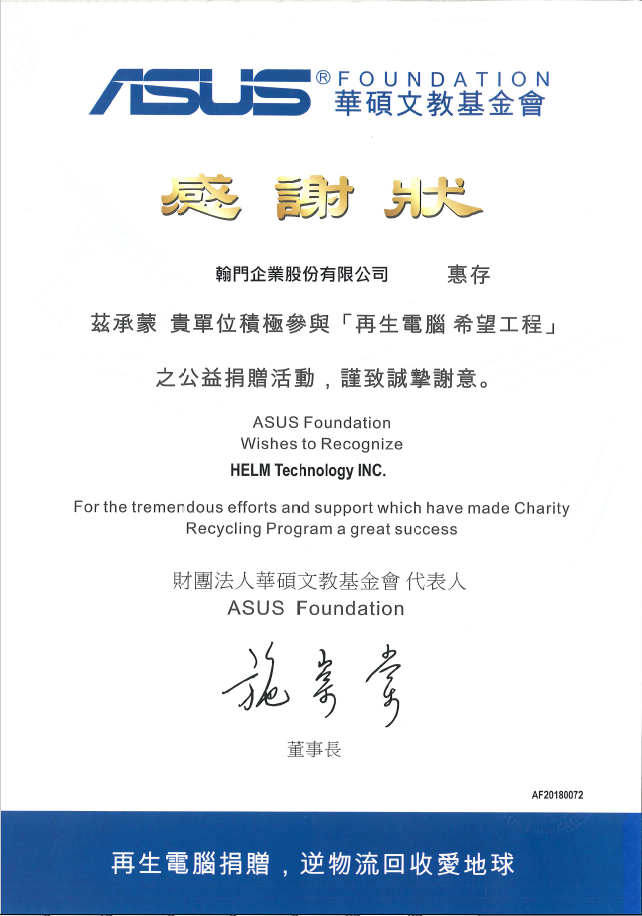 本企業因認同華碩基金會之理念特將年度有用之電腦資源,