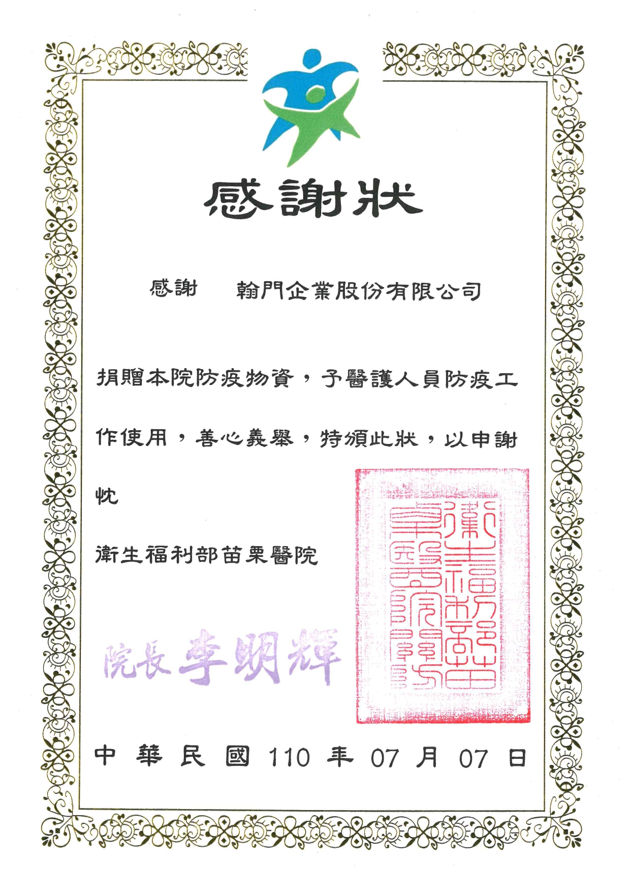 2021 衛福部苗栗醫院物資捐贈感謝