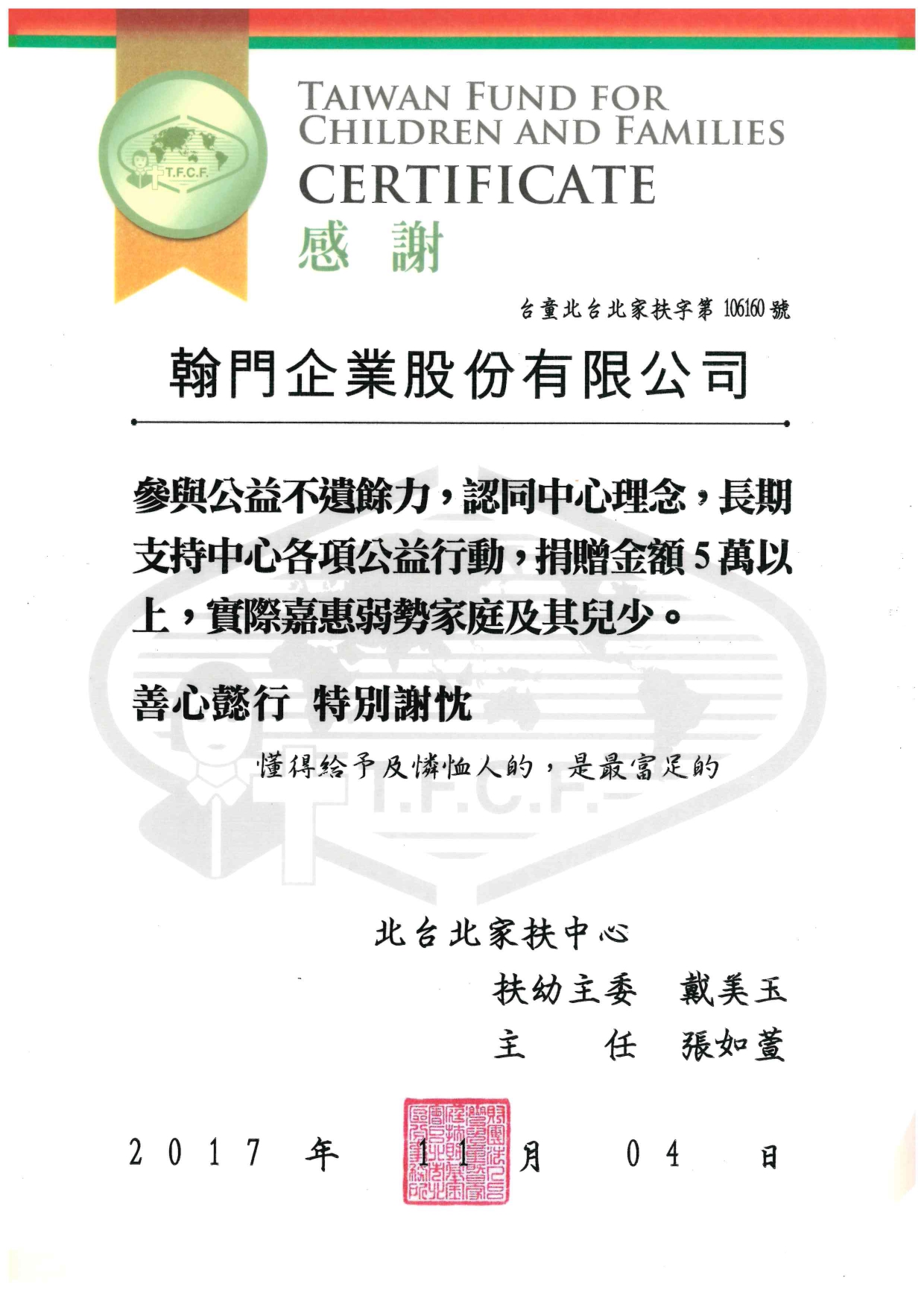 家扶基金會是一個關懷弱勢兒童少年及其家庭的國際性非營利組織,運用社會工作的專業方法,讓兒少享有家庭妥善的照顧、身心安全的保護、健康成長的環境、充分受教育的機會,快樂學習的生活,期待兒少自立後能夠帶著大家的愛展翅飛翔。 本企業認同其中心理念,支持各項公益行動,捐贈金額5萬以上,提供弱勢家庭當遭受經濟困難時之兒童學習提昇、營養改善、團體輔導、獎助學金等服務。