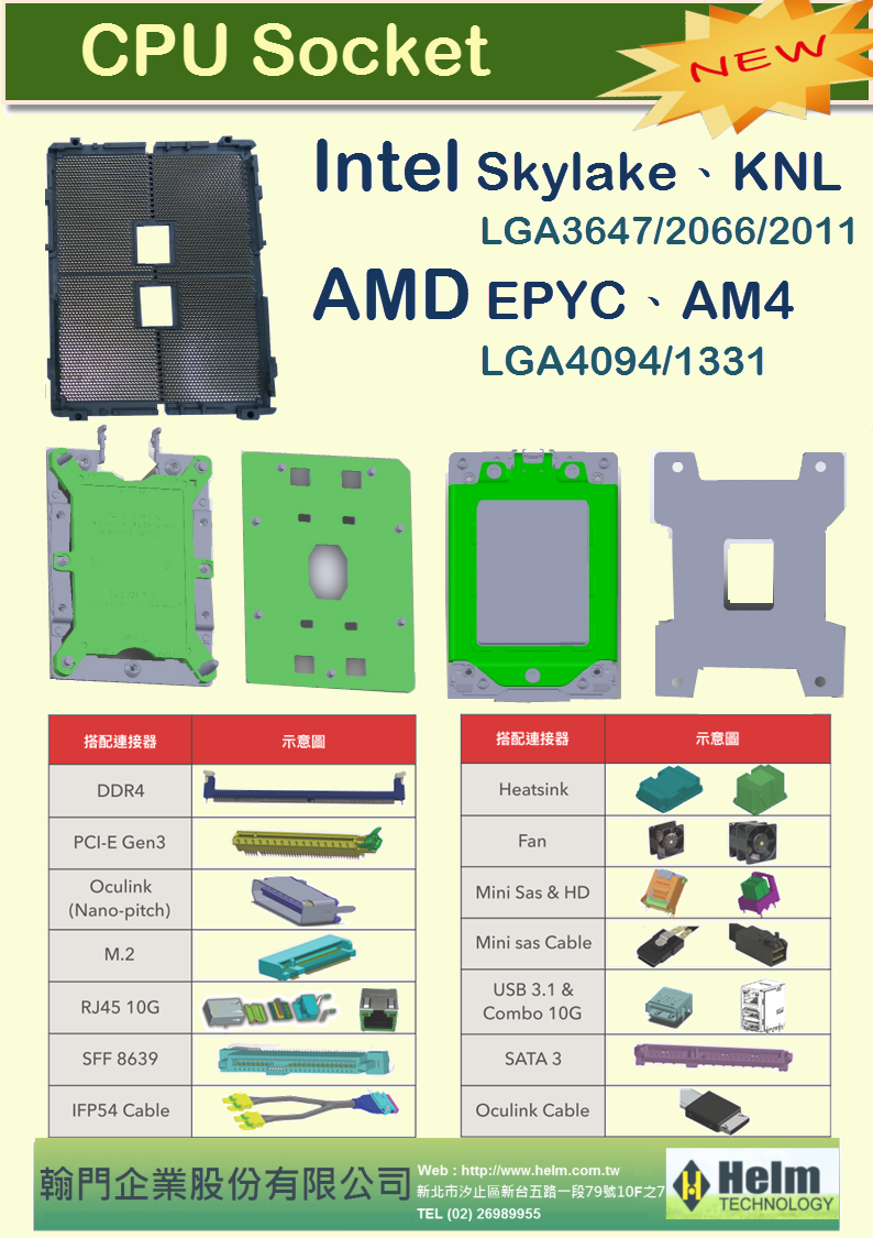 翰門企業代理FIT鴻騰精密 CPU Socket Intel/AMD INTEL Skyleake、KNL ; AMD EPYC、AM4 : LGA3647/2066/2011/4094/1331。 翰門企業 榮獲 2016 FIT最佳經銷商 2017 上半年 最佳經銷商 如有任何需求可與翰門聯繫。 TEL:+886 2 2698-9955