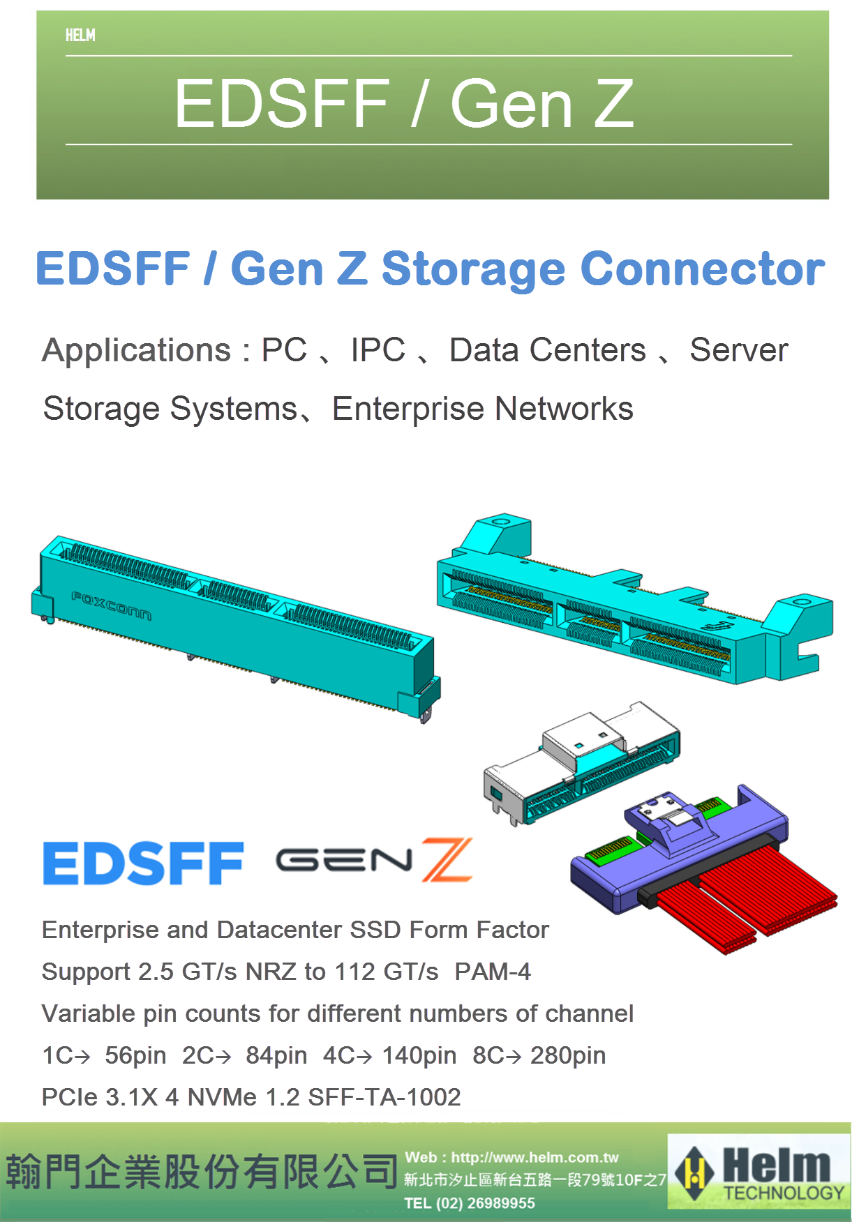 EDSFF /Gen Z Storage Connector,Support 2.5GT/s NRZ 、112GT/S PAM-4 Fit設計出各種不同的介面連接器如M.2、U.2、SAS 、Mini SAS HD、 SATA 等高速產品來搭配客戶的應用。 如有任何需求可與翰門聯繫。 翰門企業 榮獲 2017 FIT最佳經銷商