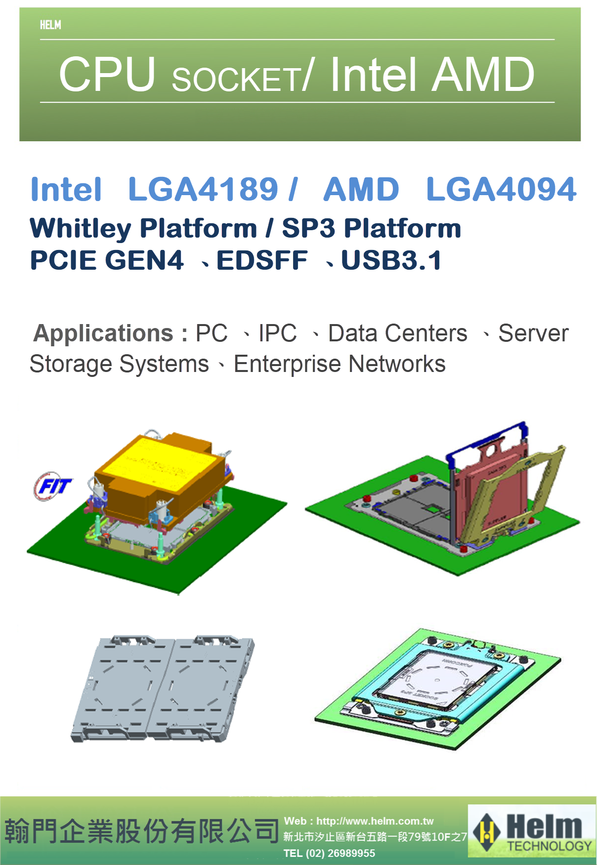 CPU Socket 4189、4094系列產品 、 搭配DDR4 SMT、PCIE Gen4、EDSFF、OCP3.0、GENZ、USB3.1、RJ10G、SFP、QSFP 系列連接器產品。 如有任何需求請聯繫HELM。 TEL:+886 2 2698-9955 資訊交流網:http://niehaha.idv.tw/ 線上訂單:http://shop.helm.com.tw/