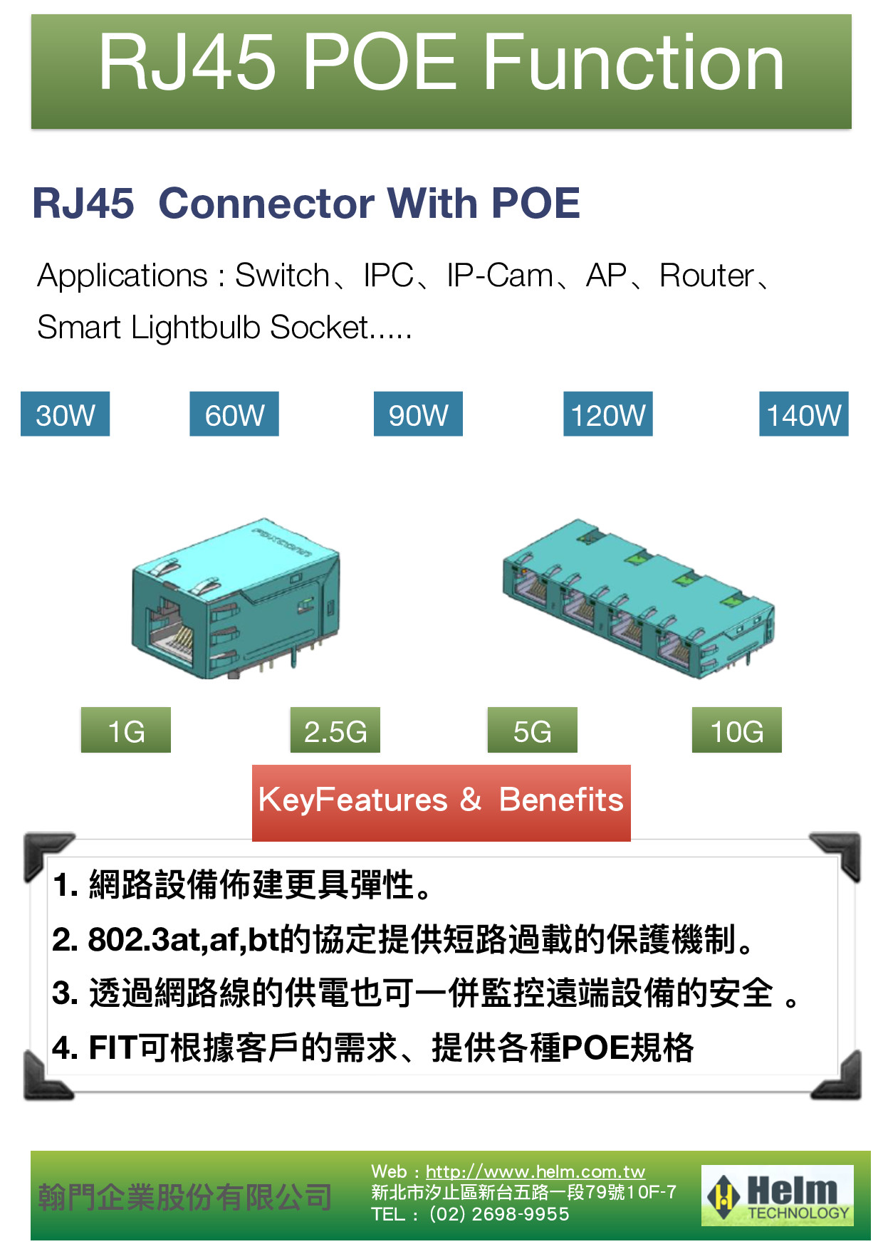 鴻騰精密已開發出全系列POE Function的產品,可根據不同的電力需求提供對應的規格,如有相關需求請洽Helm Sales。