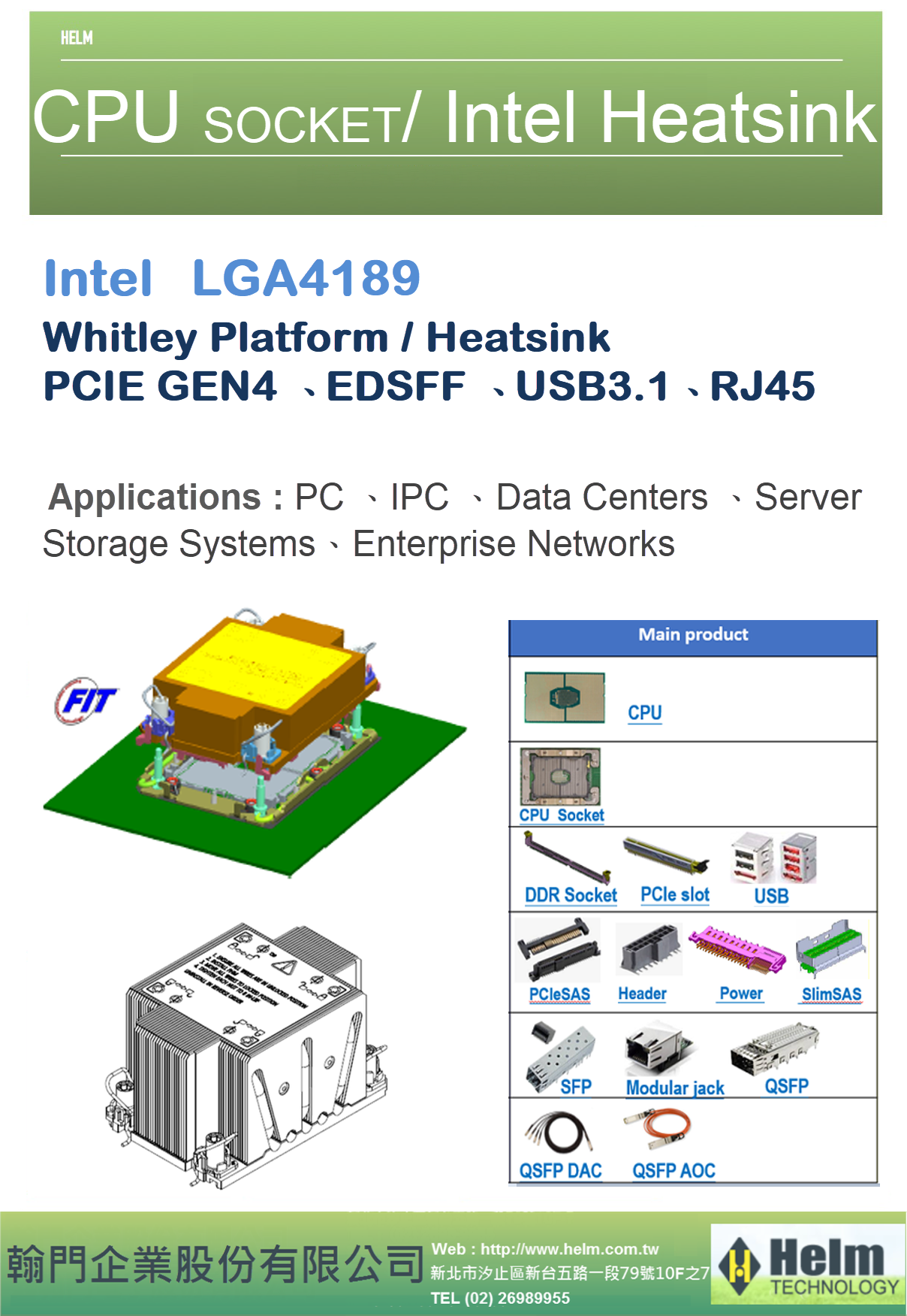 翰門企業代理FIT CPU Heatsink & Socket 4189 ( Intel AVL ) 可搭配DDR4 SMT、PCIE Gen4、EDSFF、OCP3.0、GENZ、USB3.1、RJ10G、SFP、QSFP 、SFF8654系列連接器產品。 如有任何需求請聯繫翰門企業。