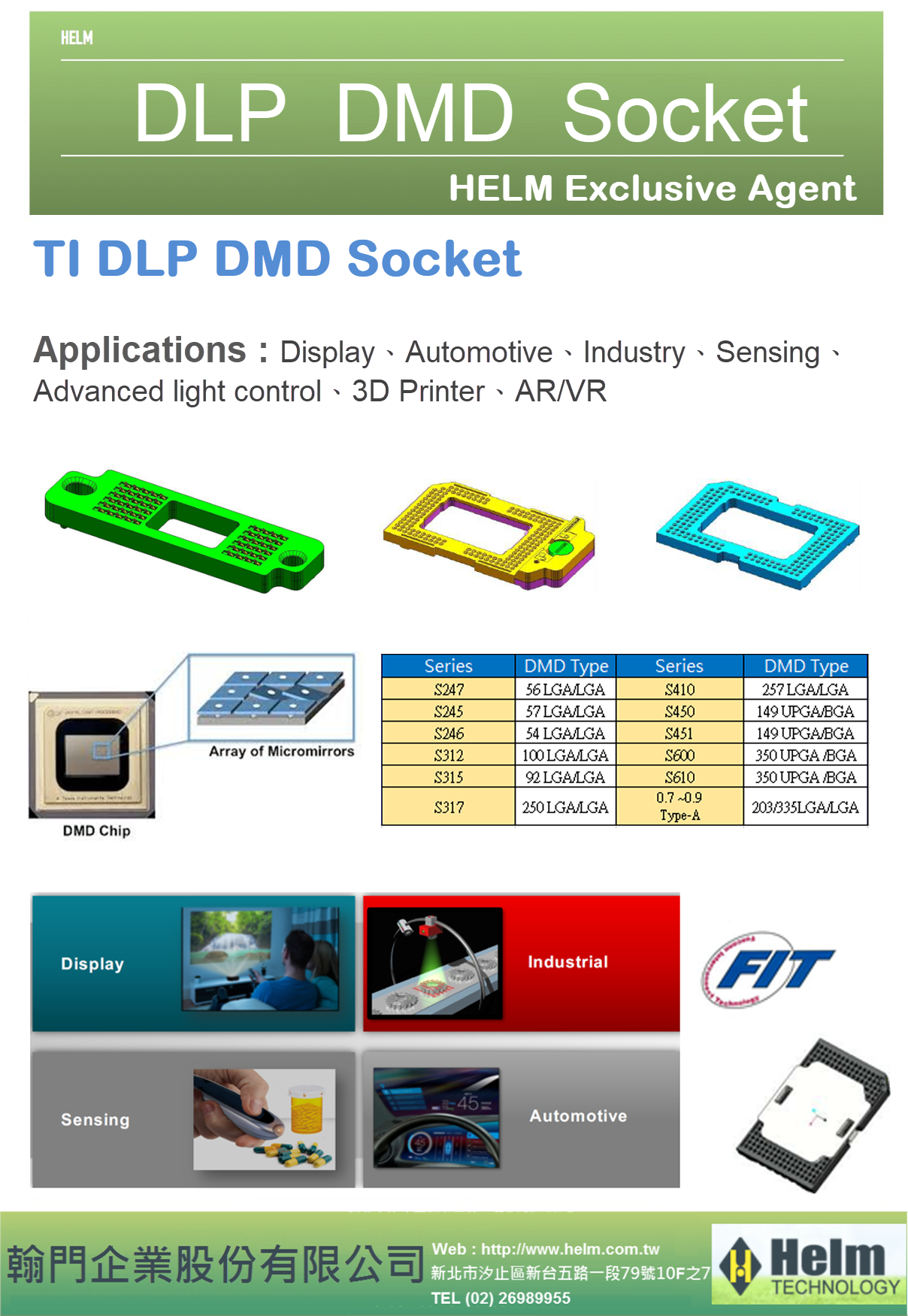 翰門企業代理 FIT 鴻騰精密 DMD Socket 可用於商用投影機、微投影機、車用、醫療、工業光學檢測設備,另有I/O 系列連接器 (Type C、HDMI2.1等) 如有相關需求請洽Helm Sales & FAE PM 團隊。