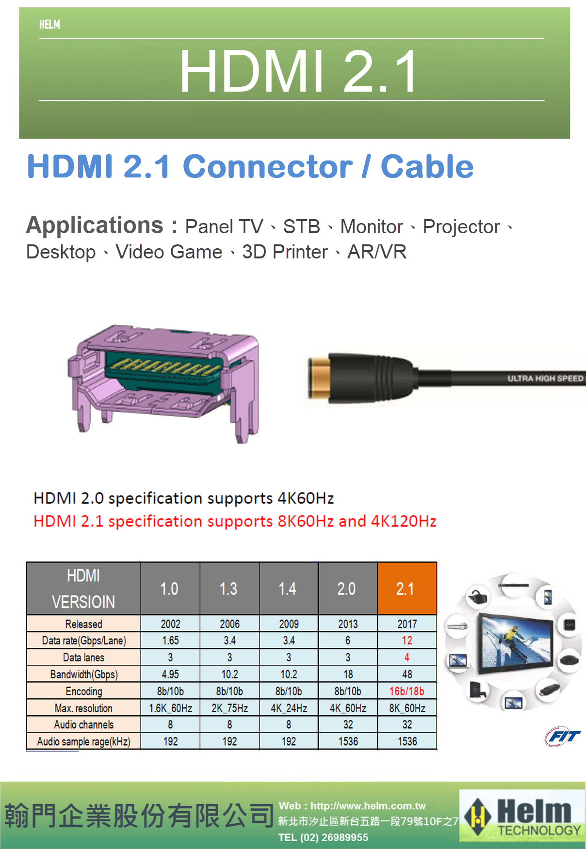 翰門企業代理 FIT 鴻騰精密 HDMI 2.1 連接器 CABLE/ PLUG,支援8K 60Hz 4K 120HZ, FIT 符合HDMI 2.1 協會認證規格,如有相關需求請洽Helm Sales & FAE PM 團隊。