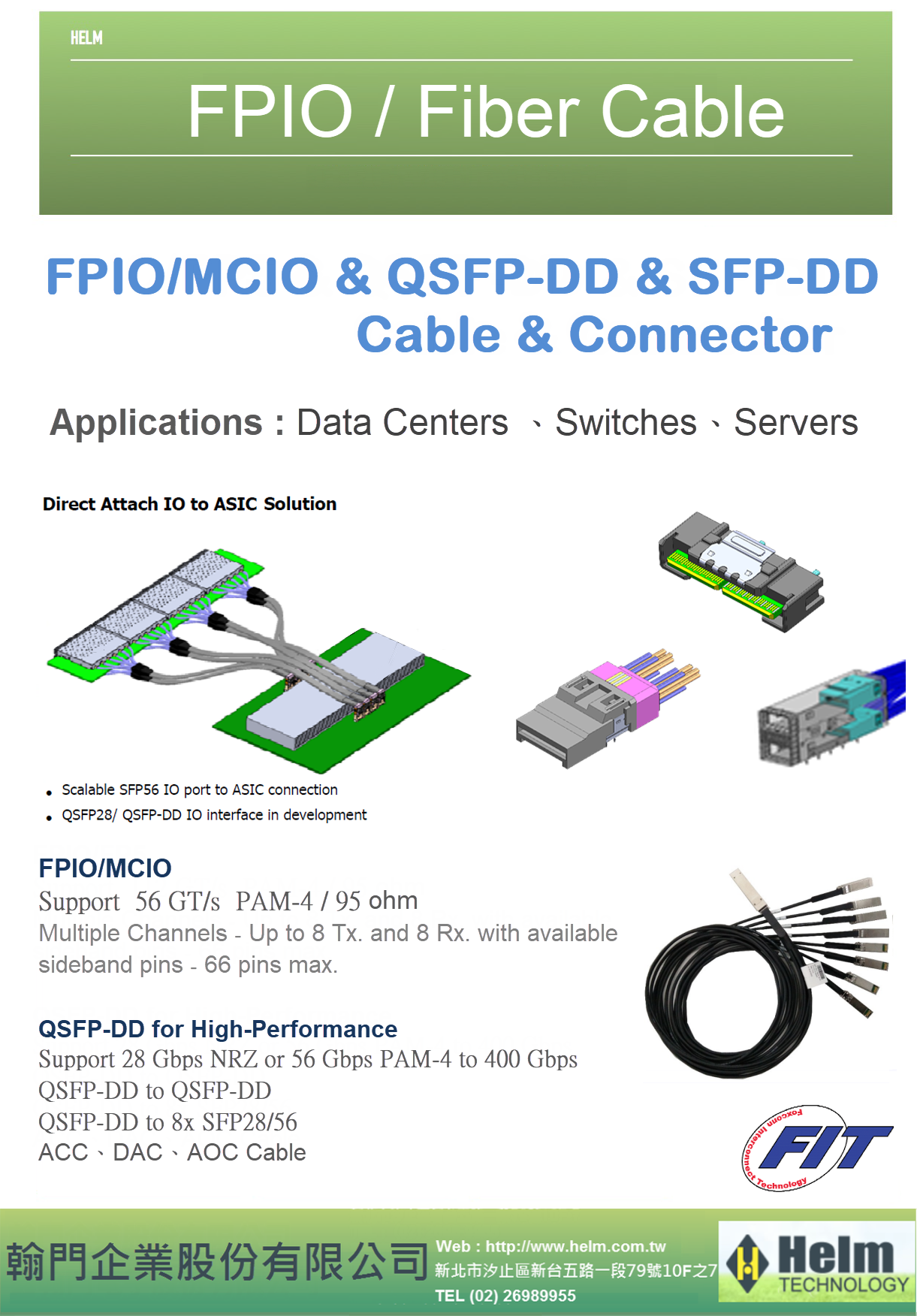 鴻騰精密已開發出FPIO MCIO,QSFP-DD AOC ACC DAC CABLE,另有Fiber 系列 CONN、QSFP-DD、SFP-DD、 QSFP28等的規格,如有相關需求請洽Helm Sales & FAE PM 團隊。