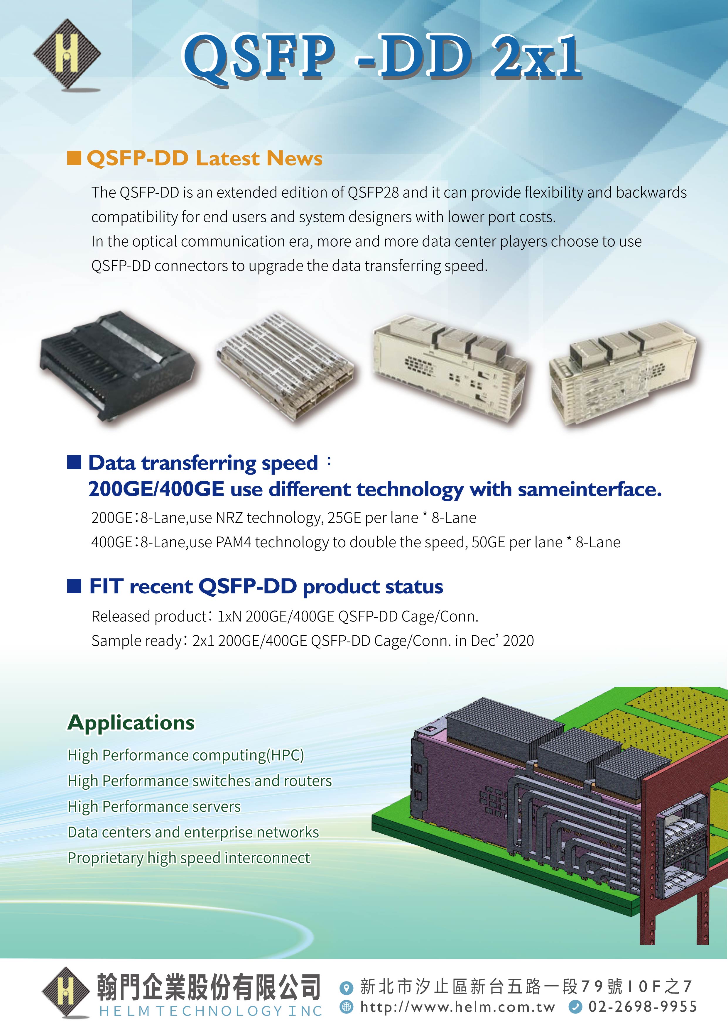 翰門企業代理: FIT QSFP DD 2X1 連接器 QSFP-DD Rate up to 200 Gb/s NRZ, 400G Gb/s PAM-4 QSFP-DD MSA Compliant,Belly to Belly for 14W, 可搭配 BCM tomahawk4 LGA SOCKET。如有任何需求可與翰門聯繫。