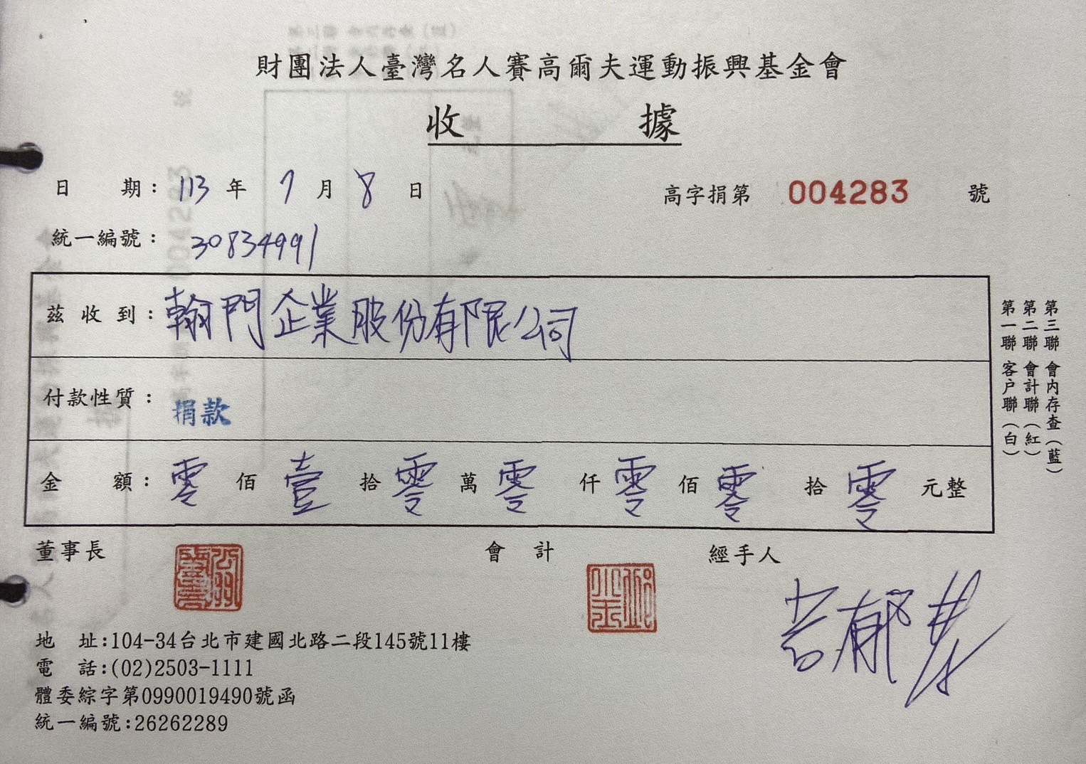 贊助款-第三十八屆三商杯高爾夫 (收據: 高字捐第004283號) 台灣名人賽暨第三十八屆三商杯高爾夫邀請賽 10/3~10/6 台灣高爾夫俱樂部(老淡水球場) 每年十月的綠夾克爭霸戰,總獎金100萬美元,各國好手齊聚台灣。 捐款金額 : NT$100,000 捐款日期 : 20240708